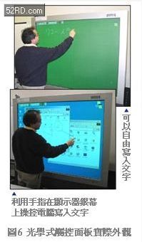 光學(xué)式觸控面板的設(shè)計(jì)必須考量雷射光線對(duì)人眼的安全,因此採(cǎi)用低功率半導(dǎo)體雷射,然而低功率半導(dǎo)體雷射卻會(huì)引發(fā)復(fù)歸光量不足等現(xiàn)象。此外,CCD會(huì)同時(shí)擷取燈泡與太陽(yáng)等外部光線,必需透過(guò)軟體的信號(hào)處理技術(shù)克服。圖6是光學(xué)式觸控面板實(shí)際外觀。一般認(rèn)為,大型光學(xué)式觸控面板非常適合應(yīng)用在教育、運(yùn)動(dòng)以及各種商務(wù)簡(jiǎn)報(bào)等領(lǐng)域。