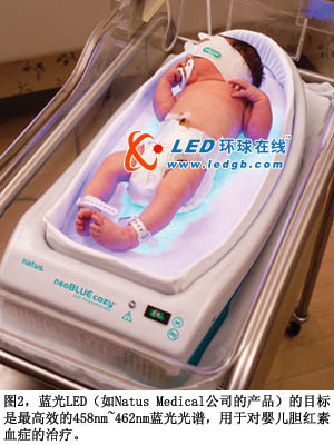 所幸,光療通常對此種病癥有效果,因為膽紅素會吸收藍(lán)光,分解為水溶形式而排出體外(圖2)。458nm~462nm區(qū)域中的窄帶藍(lán)光最有效。過去,膽紅素治療光線都采用定制的藍(lán)色熒光燈管和彩色過濾器。但是,熒光燈的光譜相對較寬。盡管其分布中心位于所需波長上,但光譜分布在兩端下降,表示能破壞膽紅素的光能量下降,因此治療時間將延長。與之相比,藍(lán)光LED膽紅素光源可以有正確的頻率,幾乎不浪費光能量。另外,LED的膽紅素光源有機械穩(wěn)定特性,更長的壽命,也比熒光設(shè)備低廉。在未來,光線療法將能通過“發(fā)光服”提供光照,提供比光箱更有效的治療方法。