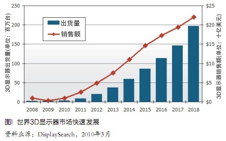 市場(chǎng)研究公司DisplaySearch日前發(fā)表一份專門報(bào)告稱,在3D電影成功的促動(dòng)下,3D顯示器市場(chǎng)將于2010年開始起飛,預(yù)測(cè)3D顯示器出貨量將從2008年的70萬(wàn)個(gè)增長(zhǎng)到2018年的1.96億個(gè),10年內(nèi)年均增長(zhǎng)率達(dá)75%,同期銷售額從9億美元增長(zhǎng)到220億美元,年均增長(zhǎng)率38%(圖1)。世界消費(fèi)電子廠商將隨著推出一批3D有關(guān)產(chǎn)品,包括電視機(jī)、監(jiān)視器、筆記本電腦、藍(lán)光盤播放器、數(shù)碼相機(jī)、攝像機(jī)、相框等進(jìn)軍家庭市場(chǎng)。加上立體顯示原來(lái)就有的醫(yī)療等專業(yè)應(yīng)用以及廣告、公共顯示牌等應(yīng)用,都會(huì)成為促動(dòng)顯示產(chǎn)業(yè)開始從平板產(chǎn)品向著3D大進(jìn)軍,這也是一次從平板顯示轉(zhuǎn)向立體顯示的革命。