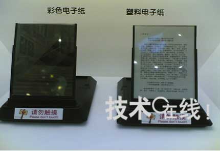 此次三星帶來(lái)了獨(dú)自開(kāi)發(fā)的塑料和彩色電子紙。塑料電子紙為16階色,彩色電子紙只能顯示4%的NTSC色域,所用材料為塑料,并將門(mén)電路集成到塑料基板上,大小為10.1英寸。塑料電子紙和彩色電子紙的厚度分別為0.7mm和0.5mm。據(jù)三星的工作人員介紹,其電子紙均從E ink采購(gòu)電泳層,然后生產(chǎn)出半成品后,銷(xiāo)售給其他電子書(shū)廠商。