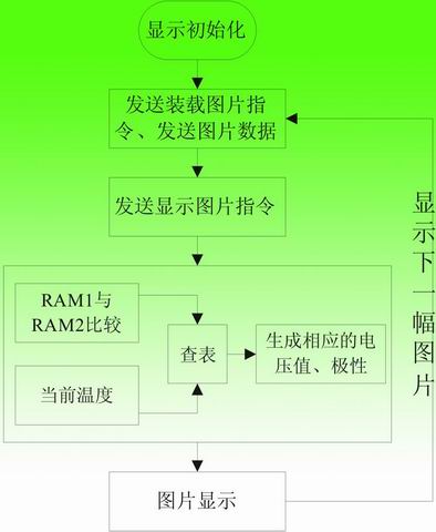 APOLLO驅(qū)動(dòng)電子紙顯示的操作流程如圖4所示。電子紙的顯示依據(jù)是要顯示的圖片與當(dāng)前顯示圖片相比較,得出其差值,再根據(jù)當(dāng)前溫度查詢對(duì)應(yīng)的數(shù)據(jù)表格,依相應(yīng)數(shù)據(jù)輸出驅(qū)動(dòng)。因此在上電后需對(duì)電子紙進(jìn)行顯示初始化,這樣后續(xù)的圖片顯示就有較好的基準(zhǔn)值。顯示初始化后RAM1數(shù)據(jù)全置為1,第一幅圖片數(shù)據(jù)存于RAM2,顯示第一幅圖片時(shí)將RAM2與RAM1進(jìn)行比對(duì),查表顯示輸出;第二幅圖片數(shù)據(jù)存于RAM1,顯示第二幅圖片時(shí)將RAM1與RAM2(存儲(chǔ)當(dāng)前圖片)進(jìn)行比對(duì),查表顯示輸出,RAM1即存儲(chǔ)當(dāng)前圖片;下一幅要顯示的圖片存儲(chǔ)于RAM2中,依次類推,循環(huán)執(zhí)行即可輸出要顯示的畫面。