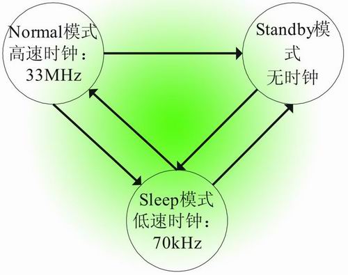 電子紙顯示的顯著特點(diǎn)之一是其省電模式,當(dāng)其顯示一幅畫面后,由于電子紙的特殊技術(shù)因素,此幅畫面在無供電或不刷新的情況下可長(zhǎng)時(shí)間保持。APOLLO芯片驅(qū)動(dòng)部分也同樣具有兩種省電模式:Sleep和Standby,能夠很好的實(shí)現(xiàn)低功耗的工作方式。Sleep模式使用低時(shí)鐘(70kHz),能夠接收主CPU的指令;Standby模式不使用時(shí)鐘,利用主CPU的喚醒信號(hào)使APOLLO恢復(fù)有效。這兩種模式與Normal模式的轉(zhuǎn)換如圖5所示。