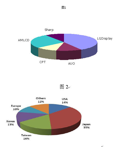 數(shù)據(jù)顯示,國內(nèi)所有的LED TV面板來源全部進口,其中有部分open cell的模式,但是背光模組仍是采用指定購買的方式。從中國大陸地區(qū)LED面板供應(yīng)來源來看,以2010年第一季度為例,主要供貨來源為LG Display, AMLCD, AUO, CPT(如圖1),其中CPT供貨多數(shù)為小尺寸。而從全球LED面板產(chǎn)值來看,日本廠商目前為市場領(lǐng)導(dǎo)者,臺灣和韓國廠商積極擴大產(chǎn)值(如圖2)。由此來看,LED TV面板產(chǎn)業(yè)市場集中度非常高,未來的LED TV市場的競爭格局主要受限于廠商的資源分配情況。