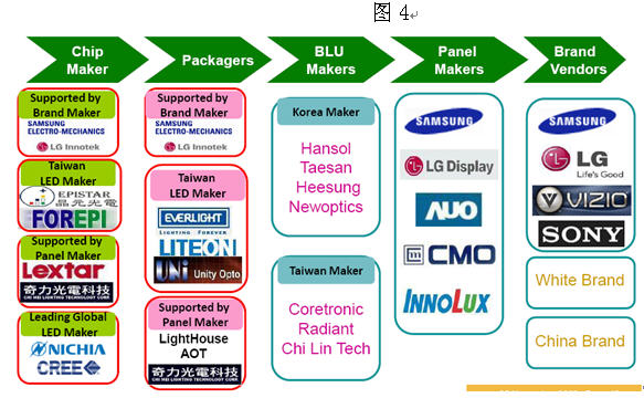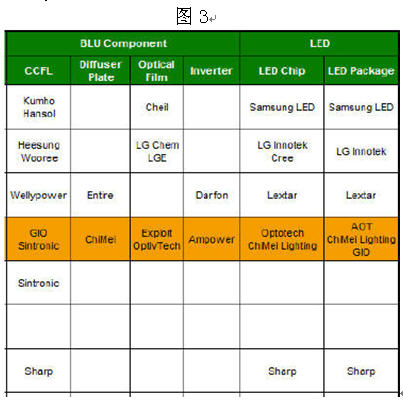 2. 目前正處于CCFL與LED背光產(chǎn)品世代交替之時, 整機廠商應(yīng)積極主動掌握LED背光資源,逐步取代CCFL,均衡健康的完成內(nèi)部供應(yīng)鏈結(jié)構(gòu)以及生產(chǎn)制造工序的調(diào)整。