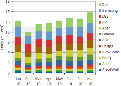 圖一 :2010年1月到8月全球前12大液晶顯示器品牌廠商生產(chǎn)計劃