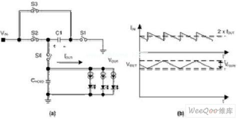 白光LED通常由一個恒定直流電流源驅(qū)動,以保持恒定的亮度。在采用單顆鋰離子電池供電的便攜式應(yīng)用中,白光LED以及電流源上的電壓降之總和可以比電池電壓更高或更低,這意味著白光LED某些時候需要對電池電壓進行升壓。完成這樣應(yīng)用的最好辦法是使用升壓DC-DC轉(zhuǎn)換器。這種方法可以大大地優(yōu)化效率,但代價是成本和PCB面積增加。另外一種提升電池電壓的方法是使用電荷泵,也稱為開關(guān)電容轉(zhuǎn)換器。本文將詳細地分析這種器件的工作原理。