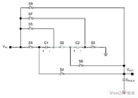 電壓升壓是通過以下的模式完成︰通過關(guān)閉S8并保持S1到S7打開,電壓轉(zhuǎn)換可以獲得1倍的增益。