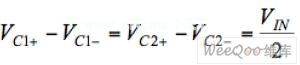 同樣的,電壓轉(zhuǎn)換在兩個階段內(nèi)完成。在第一個階段,開關(guān)S1到S3關(guān)閉,而開關(guān)S4到S8打開。因此C1和C2并聯(lián),假設(shè)C1等于C2,則充電到一半的輸入電壓︰