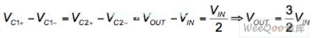 [page]輸出電容CHOLD提供輸出負載電流。隨著這個電容的放電,輸出電壓降低到期望的輸出電壓以下,第二個階段是被激活來將輸出電壓增高到這個值以上。在第二階段,C1和C2并聯(lián),連接在VIN和VOUT之間。開關(guān)S4到S7關(guān)閉,而S1到S3和S8打開。因為電容兩端的電壓降并不能突變,輸出電壓跳變到輸入電壓值的1.5倍︰