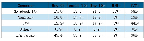 Source: DisplaySearch May 2010 Monthly TFT LCD Shipment Database