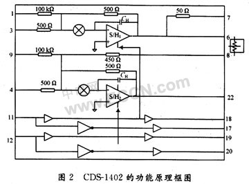 在CCD的應(yīng)用領(lǐng)域中。相關(guān)雙采樣電路得到了廣泛的應(yīng)用。很多公司專門研發(fā)了相關(guān)雙采樣的集成電路芯片。這些專用芯片不僅使用方便,且性能也能得到很大的提高。CDS1402芯片是一種典型的相關(guān)雙采樣電路芯片,它是專門為CCD成像器件研制的,用來消除復(fù)位噪聲。CDS1402進(jìn)行了優(yōu)化,適合用于10~14位轉(zhuǎn)換精度的數(shù)字視頻。低噪聲的CDS1402芯片也是利用對高低電平信號的采樣并相減來精確確定視屏信號的。結(jié)果在CCD輸出的浮動電容器上,那些剩余電荷和kTC噪聲被最大限度的消除。CDS1402芯片一共有24個引腳。它包含有2個獨立的采樣保持放大器和S/H電路,每個S/H電路都有獨立的控制線,輸人和輸出管腳,有兩個管腳提供偏置調(diào)流和調(diào)壓。一般來說,CCD的輸出信號都要連接到2個S/H的輸入端,S/H1端用來采集和保持偏置信號,它的輸出值與CCD輸出信號相減,當(dāng)CCD輸出偏置+視頻信號的時候,S/H2端就進(jìn)入信號的采集狀態(tài),從而獲得有用的視頻信號。
