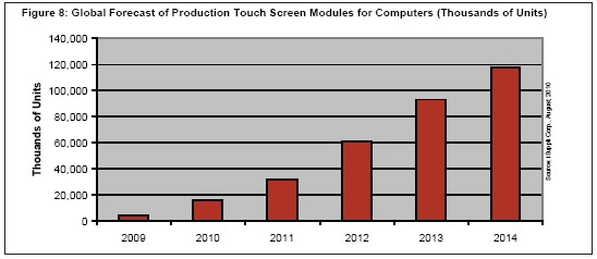 iSuppli公司預(yù)測,2014年用于電腦的觸摸屏模組全球產(chǎn)量將大增到1.179億個,而2010年是1580萬個。圖8所示為iSuppli公司對用于電腦觸摸屏全球產(chǎn)量的預(yù)測,包括臺式機(jī)、移動PC和slate以及平板電腦產(chǎn)品。