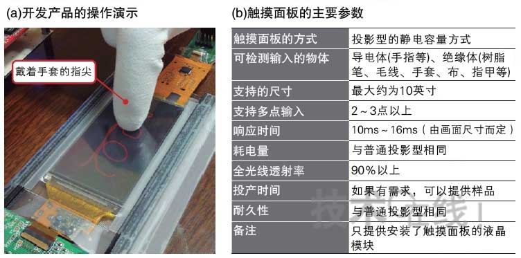 除了可以用絕緣物輸入的特點以外,在具有10ms~16ms的響應時間、90%以上的全光線透射率以及耗電量和耐久性等方面,此次開發(fā)的產(chǎn)品與普通的投影型性能相同。在檢測控制方面,可使用原來用于投影型的控制器IC。