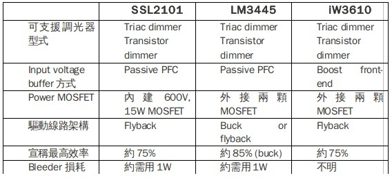 表二、市面上可見的TriacDimmableLEDLightingDriverIC