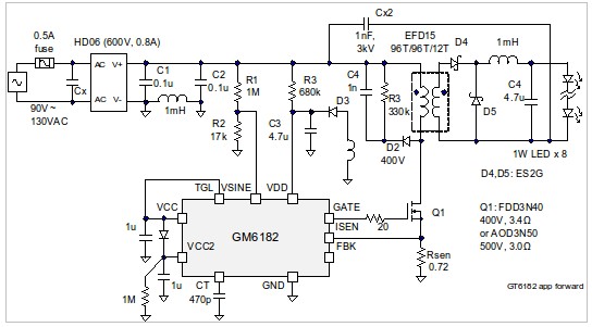 圖一GM6182高功因、高效率、具有EZDimming功能的LED驅(qū)動(dòng)器