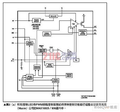 所有這些汽車內(nèi)部燈光應(yīng)用都可以采用LED作為光源,雖然地圖燈與車頂燈通??梢允褂靡活w高亮度LED來解決,但儀表板燈與車門踏板照明燈則通常需要超過一個LED串聯(lián)形成的光源,之所以采用串聯(lián)連接方式主要是為了避免不同LED間的電流不同造成顏色差異。所有應(yīng)用都必須要有內(nèi)建明暗調(diào)整功能的定電流電源,而擁有這些功能組合的一個例子為美商美信(Maxim)公司的MAX16800,這款芯片整合了所有的控制以及電流供應(yīng)電路,請參考圖1(a)。