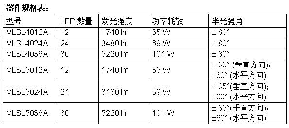 每個(gè)模塊皆配有12、24或36個(gè)高亮度LED,VLSL40xxA采用VLSL-REFL01反射鏡調(diào)整發(fā)光特性,而VLSL50xxA的發(fā)光呈蝶型。