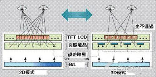 這些條紋寬幾十微米,通過它們的光就形成了垂直的細(xì)條柵模式,稱之為“視差障壁”。而該技術(shù)正是利用了安置在背光模塊及LCD面板間的視差障壁,在立體顯示模式下,應(yīng)該由左眼看到的圖像顯示在液晶屏上時,不透明的條紋會遮擋右眼;同理,應(yīng)該由右眼看到的圖像顯示在液晶屏上時,不透明的條紋會遮擋左眼,通過將左眼和右眼的可視畫面分開,使觀者看到3D影像。