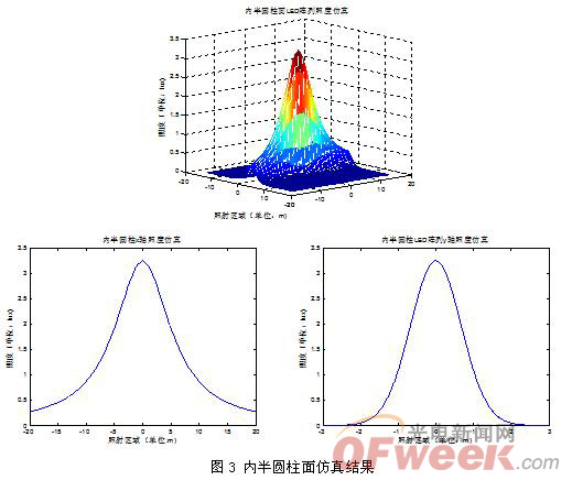 對(duì)于以上分析的兩種陣列,所用LED及數(shù)目均相同,但是根據(jù)仿真結(jié)果我們可以看出,在照度大小、照射區(qū)域等方面存在很大的區(qū)別。代表平面的矩形分布的陣列中心照度比較大,達(dá)到了40Lux,但是其照射區(qū)域比較小,20Lux內(nèi)僅有約0.75m的范圍內(nèi),而代表曲面的內(nèi)半圓柱表面分布的陣列中心照度比較小,僅為3.3Lux,但照射區(qū)域比較大,最大照度值一半的區(qū)域在一方向上達(dá)到了7m。