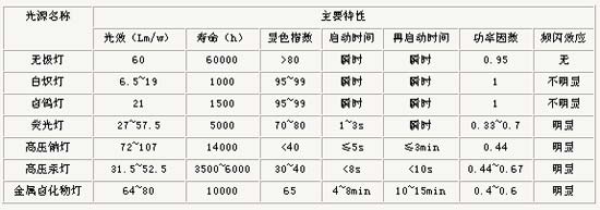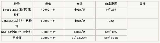 無極燈與其它光源參數(shù)值比較