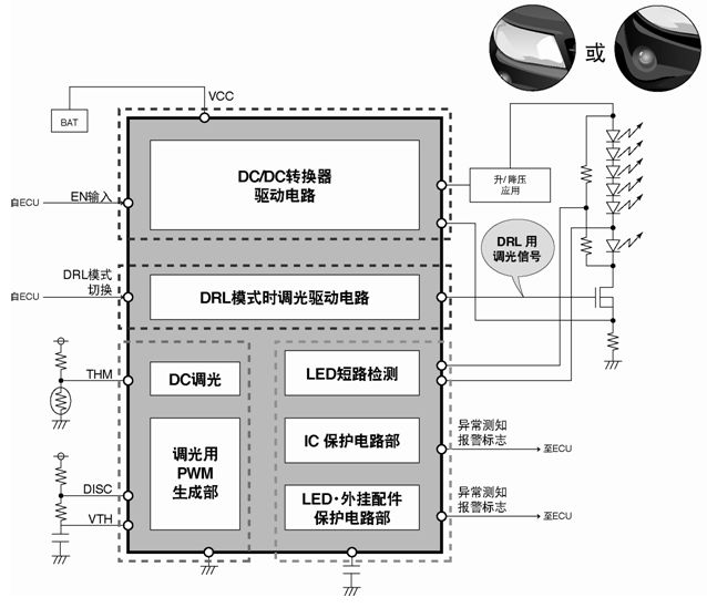 最近,汽車用前照燈正在逐漸推進LED化,以高效、長壽這一優(yōu)點為背景,未來有望成為前照燈市場的重心。此外為確保車輛安全、可見度,安裝使用LED前照燈的事例會不斷增加,而未來預計LED前照燈/DRL的搭載也將面向車載用途形成標準規(guī)格系列。目前,LED前照燈只限于高級豪華車等一部分的車型上選用,對汽車制造商、前照燈制造商來說,多采用延用通用的LED驅動IC,或以分立元器件為主構成的形式,如果裝載DRL就需要另外配備與其相配的驅動電路。羅姆針對未來前照燈的LED化,率先著手開發(fā)了一款專用的IC,并推動獲得前照燈用LED驅動器所需功能的專用IC的開發(fā)。此次羅姆新開發(fā)的這種前照燈專用LED驅動IC,特別面向歐美等國先行開始普及的DRL,通過內置振蕩器電路實現微處理器控制的PWM調光。另外,為對應要求高可靠性的車載市場需求,在搭載能監(jiān)測LED短路、LED開路等前照燈故障的各種保護功能,與分裝器件構成時或與通用的LED驅動IC組成時的情況相比,通過削減部件數量從而實現了可靠性的大幅提高。另外,絕對最大電壓設定為50V,對于鋰離子電池電壓波動也能非常輕松地承受的高耐壓化也得以實現。