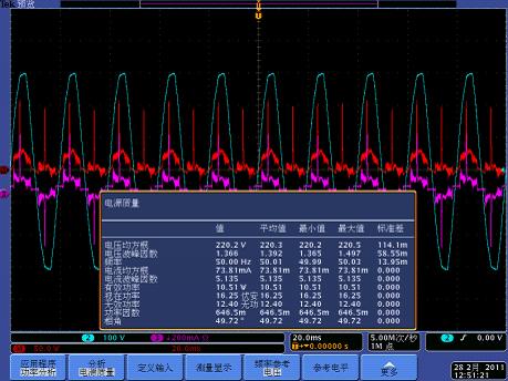 測量驅(qū)動電源的輸入功率、功率因數(shù)和諧波有很多方法,使用具有電源分析功能的泰克示波器產(chǎn)品可以輕松實現(xiàn)這些電能質(zhì)量測量。使用一路通道測量輸入電壓、一路通道測量輸入電流,配合示波器內(nèi)置的PWR電源分析軟件,所有的電能質(zhì)量相關(guān)參數(shù)可以直接顯示在屏幕中。
