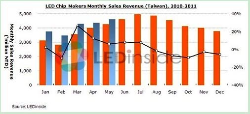 近日消息,據(jù)統(tǒng)計(jì),2011年5月臺灣上市上柜 LED 廠商營收總額約新臺幣99.57億元(月成長5.8%、年成長8.3%)。