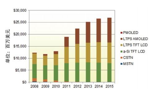 市場調(diào)研公司DisplySearch表示,因新興經(jīng)濟(jì)市場繼續(xù)走俏,轉(zhuǎn)向智能手機(jī)趨勢增強(qiáng),技術(shù)要求提高,包括加大顯示屏尺寸、改進(jìn)分辨率等。預(yù)測2011年其顯示屏出貨量將迅速提升到18億片,增長12.5%,銷售額更將大幅增長47%,達(dá)到188億美元,2012年續(xù)增19%,達(dá)224億美元,預(yù)計(jì)2015年有望達(dá)到約270億美元,2010~2015年的年均增長率為16%,前景可觀(圖l)。