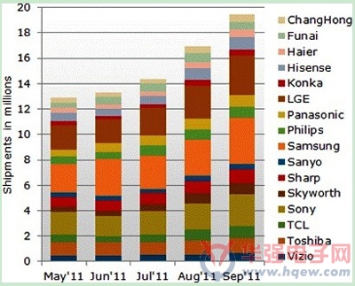 根據(jù)DisplaySearch的 MarketWise-LCD Industry Dynamics 報告,全球前十六大品牌商7月份電視總產(chǎn)量為1,440萬臺,8月份為1,690萬臺,9月份更將提高到1,940萬臺。另一方面液晶電視 OEM / ODM廠商7月份產(chǎn)量估計達390萬臺,8月份為470萬臺,9月份將達540萬臺。
