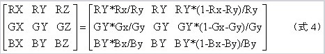 白色由RGB三原色混色而成,因此,如給出RGB三色的亮度值RY,GY,BY,就可以計(jì)算出RGB三色各自的三刺激值。