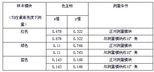 由表1可見,即使人為的偏離基準(zhǔn)測(cè)量位置達(dá)10°角,測(cè)得的色坐標(biāo)數(shù)據(jù)也沒有明顯變化,因此,除去儀器本身固有的精度等原因帶來的測(cè)量誤差,由人對(duì)儀器進(jìn)行操作帶來的測(cè)量誤差也基本可以忽略。