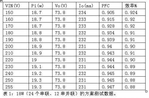 在AX2028_TUBE_18W非隔離應(yīng)用設(shè)計(jì)(圖4)中,LED光源陣列設(shè)計(jì)為0.06W白光LED(SMT或草帽燈)24個(gè)串聯(lián)、12串并聯(lián)的方案,驅(qū)動(dòng)288個(gè)小功率WLED,總功率為18W。