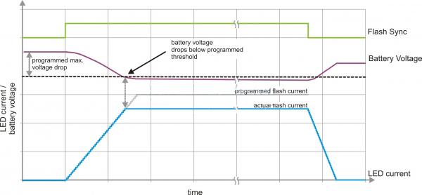 TI 擁有一種監(jiān)控電池電壓的閃光燈驅(qū)動器技術(shù)。要獲得穩(wěn)定的LED 電流波形并且避免過多的電池壓降,閃光燈驅(qū)動器要主動控制LED 電流上升/下降順序。在上升階段(上升斜率為25mA/12µs),要對輸入電壓進(jìn)行監(jiān)控。如果輸入電壓降至某個(gè)設(shè)定閾值以下,則器件即刻停止讓LED 電流進(jìn)一步上升至該設(shè)定閾值,并將閃光燈電流保持在實(shí)際電平,參見圖5。