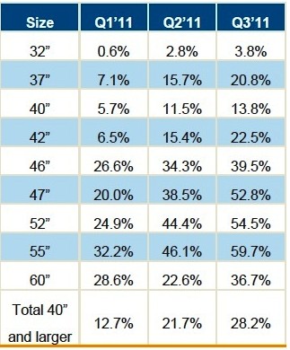 2011年第一季~第三季各尺寸3D電視面板滲透率