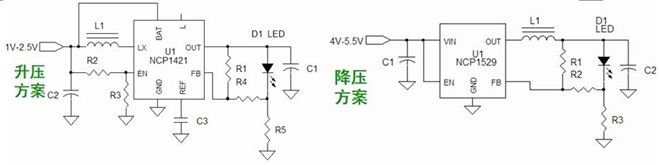 圖3:基于NCP1421的升壓型和基于NCP1529的降壓型1-3 W手電筒LED應(yīng)用