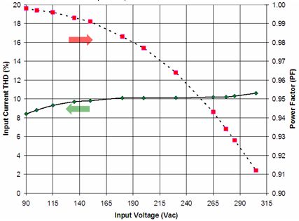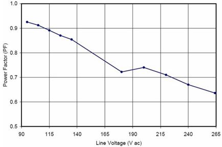 在針對(duì)商業(yè)照明的應(yīng)用中使用的是寬動(dòng)態(tài)范圍的精確導(dǎo)通時(shí)間控制器方案NCL30000。設(shè)計(jì)中采用控制器(外置FET等旁路元件)方案的原因包括易于在能效和成本之間實(shí)現(xiàn)折衷、能以單顆控制器支持寬功率范圍(5到30 W)、及便于優(yōu)化散熱及靈活布線等。基于NCL30000構(gòu)建的90到305 Vac EFD25演示板(Vout = 12 LED, 37 Vdc)測(cè)試顯示,功率因數(shù)遠(yuǎn)高于0.9,部分輸入電壓條件下功率因數(shù)甚至高于0.95(見(jiàn)圖9),能效也極高。