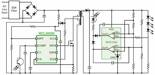 如前所述,為低功率LED照明應(yīng)用選擇適合的驅(qū)動(dòng)器須考慮眾多因素,這其中,有關(guān)功率因數(shù)等行業(yè)標(biāo)準(zhǔn)尤為重要。接下來(lái),我們將以安森美半導(dǎo)體的幾款低功率LED通用照明驅(qū)動(dòng)方案為例,探討如何在低功率照明應(yīng)用中提供高功率因數(shù)。