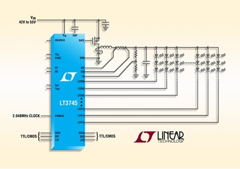 凌力爾特公司 (Linear Technology Corporation) 推出一個集成了55V 降壓型控制器的16通道LED驅(qū)動器LT3745。該LED 驅(qū)動器為每通道加電至 75mA LED 電流,可驅(qū)動高達36V的串聯(lián)LED,從而使該器件非常適用于諸如大型LED廣告牌等應(yīng)用。每個通道都有單獨的 6 位點校正電流調(diào)節(jié)和12位灰度等級PWM調(diào)光。加上0.5μs 的最短LED接通時間,LT3745提供了非常寬的動態(tài)對比度。點校正及灰度等級均可通過 TTL/CMOS 邏輯電路中的一個串行接口獲得。LT3745 的 60V 至55V輸入電壓范圍非常適用于商用和工業(yè)設(shè)計中的寬輸入電源范圍,一般在12V至48V之間。最少的外部組件加上6mm x 6mm QFN封裝可為多通道 LED 應(yīng)用提供占板面積高度緊湊的解決方案。