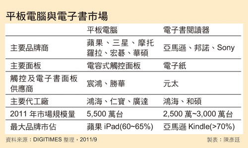 蘋果iPad系列持續(xù)在平板計(jì)算機(jī)市場一枝獨(dú)秀,爆發(fā)性成長讓各家電信、PC及手機(jī)制造廠趨之若鶩,由于平板計(jì)算機(jī)具備多媒體觸控特性,讓電子書閱讀器業(yè)者憂心忡忡,擔(dān)心平板計(jì)算機(jī)大軍崛起恐沖擊電子書市場,然蘋果憑借軟件、成本、價(jià)格與規(guī)模優(yōu)勢,陸續(xù)讓部分平板計(jì)算機(jī)業(yè)者知難而退,反觀電子書市場穩(wěn)定成長,供應(yīng)鏈廠商業(yè)績持續(xù)翻揚(yáng),平板計(jì)算機(jī)大軍暫難發(fā)揮影響力,讓電子書廠商暫時(shí)松了一口氣。就目前平板計(jì)算機(jī)品牌版圖來看,仍以蘋果iPad系列獨(dú)占鰲頭,業(yè)界預(yù)估2011年市占率約60~65%,其次是三星電子(Samsung Electronics),市占率約5~6%,其它各品牌廠市占分別落在1~3%,尤其是2011年初時(shí)被業(yè)界視為蘋果iPad殺手,未推出產(chǎn)品就先轟動(dòng)的惠普(HP)、RIM及摩托羅拉(Motorola)等品牌廠,推出前預(yù)估出貨量很高,然這些憑借品牌及軟件平臺光芒的先頭部隊(duì)卻最先敗陣,讓現(xiàn)存平板計(jì)算機(jī)業(yè)者更加憂心。