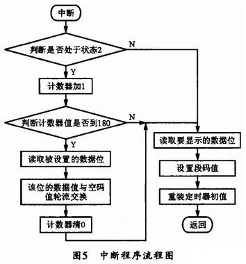 在狀態(tài)2下,參數(shù)設(shè)定時(shí),設(shè)定位要實(shí)現(xiàn)閃爍,以確定正在被設(shè)置的數(shù)據(jù)位。實(shí)現(xiàn)閃爍的基本思想是每隔500 ms,當(dāng)前閃爍數(shù)據(jù)位的段碼值就由數(shù)據(jù)狀態(tài)變?yōu)榭沾a狀態(tài),下一個(gè)500 ms再由空碼狀態(tài)變?yōu)閿?shù)據(jù)狀態(tài),并不斷循環(huán)執(zhí)行此操作(共陽(yáng)極顯示方式下空碼值為0XFF)。這樣,從用戶(hù)角度看,當(dāng)前被設(shè)定的數(shù)據(jù)位就是閃爍的。這里可通過(guò)設(shè)定一個(gè)計(jì)數(shù)器來(lái)確定轉(zhuǎn)換時(shí)間,當(dāng)計(jì)數(shù)值達(dá)到500/2.78(約為180)時(shí),當(dāng)前閃爍數(shù)據(jù)位就進(jìn)行段碼值轉(zhuǎn)換。本系統(tǒng)的中斷程序流程圖如圖5所示。