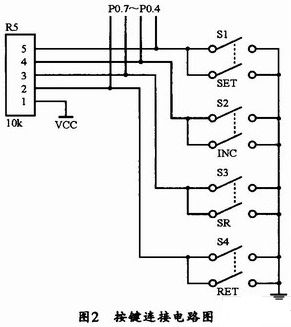 獨(dú)立式鍵盤(pán)通常用在按鍵較少的系統(tǒng)中,每個(gè)按鍵單獨(dú)占有一根I/O口線(xiàn),各鍵的工作狀態(tài)相互獨(dú)立,互不影響。由于本文的顯示面板的調(diào)節(jié)按鍵只有4個(gè),因此,設(shè)計(jì)使用獨(dú)立式按鍵接法。其鍵盤(pán)接口電路如圖2所示。