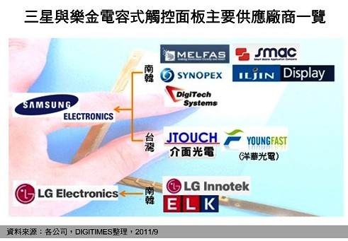 DIGITIMES Research 分析,相較于樂(lè)金主要向韓廠LG Innotek與ELK (Electro Luminescence Korea)采購(gòu)觸控面板,三星不僅向Melfas、SMAC (Smart Mobile Application Company)、Synopex、Iljin Display、Digitech Systems、Moreens等韓廠采購(gòu),亦向日廠、臺(tái)廠與大陸業(yè)者采購(gòu)觸控面板,可知三星于觸控面板采購(gòu)多角化發(fā)展較樂(lè)金顯著。