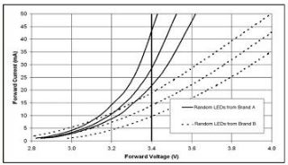 即使是同一型號的LED其伏安特性在各個個別的器件之間也是不同的,更何況在不同生產(chǎn)廠家之間就更是不同了(圖8)。
