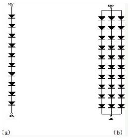 多個LED也可以采用串并聯(lián)的結構,通常我們稱之為幾串幾并。例如10串3并就是如圖9b的結構。
