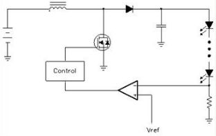 圖中顯示了一個基本的電感升壓電路,其中控制器(Control)給出了一個PWM開關信號來控制大功率開關管,后者在導通時對電感充電,而在斷開時電感中的能量就對電容充電。經(jīng)過幾次開關以后就可以把輸入電壓泵至更高的電壓,從而完成升壓的任務。改變PWM信號的工作比就可以改變其輸出電壓。為了保持輸出電流的恒定,就要求測量輸出電流值,這是靠一個和LED串聯(lián)的小電阻來測量的。這個電阻上的電壓就和一個參考電壓相比較,比較所得出的誤差信號就送去控制器用以改變PWM信號的工作比,這樣就實現(xiàn)了一個閉環(huán)自動控制,以控制其輸出電流為恒定。
