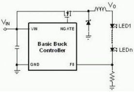 通常儲能電感是和LED串聯(lián),開關導通時,電感儲能;開關斷開時電感通過二極管繼續(xù)有電流流通。由于輸出電壓是輸入電壓減去電感電壓,所以是降壓型。LED中的電流經(jīng)過檢測電阻測量以后反饋回控制器。來控制PWM的工作比,以實現(xiàn)恒流的控制。