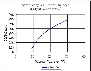 降壓型恒流源的缺點是要求輸入電壓高于輸出電壓,而太陽能LED路燈中所采用的蓄電池往往是12V,頂多是24V。而路燈中的LED通常是10個串聯(lián),其所要求的總輸出電壓往往在33V-36V左右,因此較難采用降壓型的恒流源。而降壓型恒流源的優(yōu)點是效率高。因為輸入電壓高于輸出電壓,所以輸入電流小于輸出電流。電流小有助于減小電阻性損耗。圖15表明一個降壓型恒流源在輸入電壓固定在35V,輸出電流固定在2A時,其效率和輸出電壓的關系曲線。