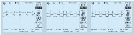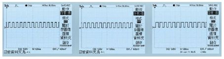 在計算機操作界面上,對第一路的DAC0832 輸入為100, 第二路為200, 第三路的電流值為255,測得對應支路LED 的電流值為54mA、106mA、134mA,對應2SK1058 的驅(qū)動波形分別圖4 所示。