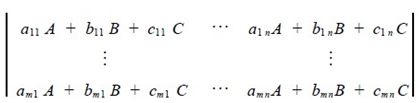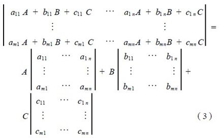 式(3) 中的各項分別代表紅、綠、藍(lán)單色圖像,是具有若干灰度級的,如果aij 、bij 、cij 的取值分別從0 到N ,那么,每一單色圖像的灰度級為N + 1。根據(jù)矩陣運(yùn)算法則有