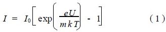 式中m 為復(fù)合因子, I0為反向飽和電流, UT =kT/e 稱為溫度電壓當(dāng)量,在熱力學(xué)溫度T = 300 K時,UT = 26 mV1 在寬禁帶半導(dǎo)體中, 當(dāng)I <0. 1 mA時,通過結(jié)內(nèi)深能級進(jìn)行復(fù)合的空間復(fù)合電流起支配作用,這時m = 2 ;電流增大后擴(kuò)散電流占優(yōu)勢時m = 1.U 為外加電壓。
